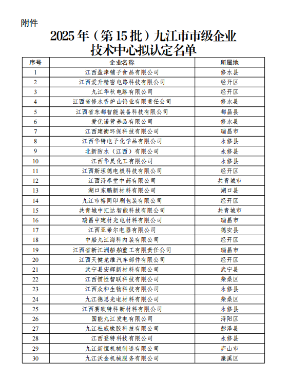 为推动企业成为研究开发投入、技术创新活动和创新成果应用的主体,不断提升企业自主创新能力、资源整合能力和市场竞争能力,市工信局向各县(市、区)公开征集了2025年(第15批)市级企业技术中心,截至2025年3月31日,共收到66份市级企业技术中心申报材料。经各县(市、区)工业和信息化主管部门初审推荐、市工信局复核、税务核查、专家评审、实地核查等环节,拟认定30家市级企业技术中心(名单详见附件)。现将结果予以公示,公示时间为2025年9月12日至2025年9月18日,公示期间,如有异议或有需要反映的情况,可通过电话向九江市工信局进行反映,联系电话:0792-8211537。